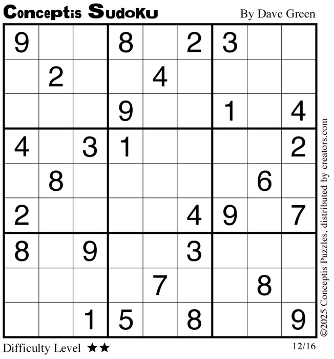 Each puzzle consists of a 9x9 grid containing given clues in various places. The object is to fill all empty squares so that the numbers 1 to 9 appear exactly once in each row, column and 3x3 box.