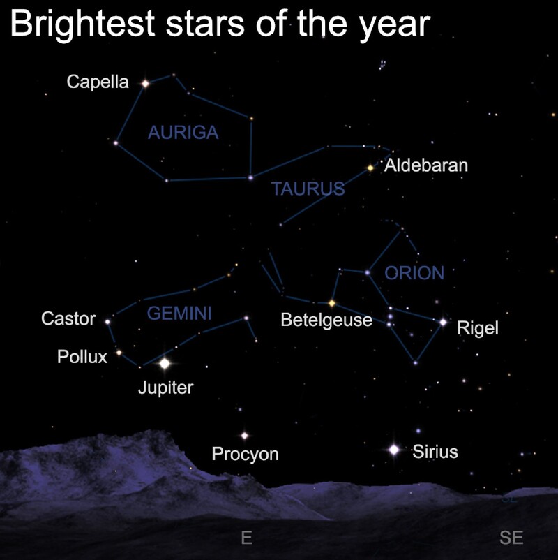 Go outdoors a few hours after dark at this time of year, and you'll find eight of the 25 brightest stars glistening overhead. The brightest, of course, is Sirius, the main star in Canis Major, the great dog. At this time of year, you find this gem sparkling low in the southeastern sky shortly after dark.